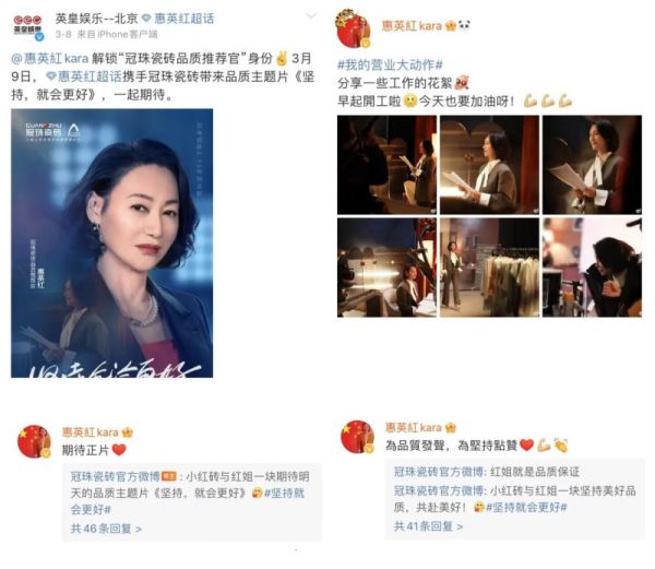 很多人可能沒留意,3月9日冠珠瓷磚官博發布《堅持就會更好》品質主題片之后,惠英紅立馬在評論區與官博互動,惠英紅所屬經紀公司英皇娛樂也官宣了該影片和惠英紅品質推薦官的身份。3月11日,惠英紅更是將片中花絮照片與粉絲分享。