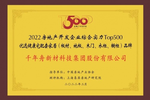 千年舟憑借領先的綜合實力,榮膺「2022年房地產開發企業綜合實力TOP500首選供應商·無醛添加人造板類」代表企業、「2022年房地產開發企業綜合實力TOP500優選健康宅配套家居(板材、地板、木門、衣柜、櫥柜)品牌」兩項榮譽稱號。