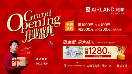 4月9日雅蘭家紡「惠州金山湖中心店L4-18」于隆生金山湖購物中心盛大開業,此次新店的開業,為惠州的市民朋友們再次帶來美好品質睡眠體驗,演繹生活與藝術的純粹美學,傳遞雅蘭56年的匠心風骨、品質之美。讓你的生活多一點幸福,多一些純粹。