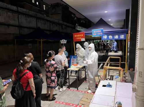 “手套、防護服先穿好,搭建臨時帳篷、設登記處、備桌子及有靠背的椅子、方凳,中午休息時用84消毒液噴灑外環境消殺一次,確保核酸檢測安全有序”項目志愿者小殷說道。自今年4月廣州市白云區遭受到新型冠狀病毒感染肺炎疫情影響以來,本著“疫情就是命令,防控就是責任”的態度,中鐵二局城通公司廣州地鐵十一號線項目部主動請纓,迅速組建20名志愿者隊伍,出動叉車,攜帶鐵馬、警示帶、扎帶等物資,做好搭建隔離圍欄、維護現場秩序等防控工作,積極響應地方政府疫情防控工作部署。