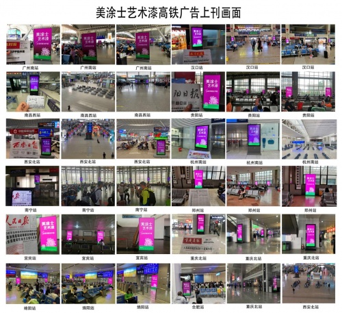 五一出游高峰期間,美涂士藝術漆“從底到面抗甲醛”廣告霸屏橫掃全國核心樞紐重點高鐵站,上百個途徑站點以及終端媒體,美涂士藝術漆高鐵廣告實現全面投放,搶占品牌傳播高地,觸達全國十三億精準流量!這波操作視覺沖擊力強、廣告觸達率高,具有無可比擬的品牌展現優勢,為美涂士品牌注入新勢能!