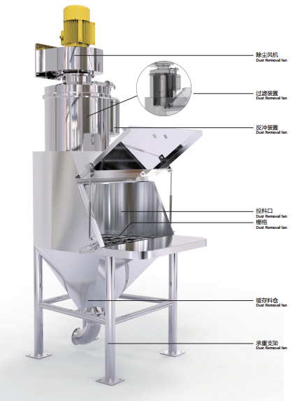 此設(shè)備采用新型集塵裝置,并配備振動(dòng)器輔助卸料,使整個(gè)投料過程中無粉塵、順暢、不浪費(fèi)物料,是目前國內(nèi)最為理想的人工投料站設(shè)備。
