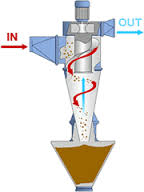 當(dāng)含塵氣流由進(jìn)氣管進(jìn)入旋風(fēng)分離器時,氣流將由直線運(yùn)動變?yōu)閳A周運(yùn)動。旋轉(zhuǎn)氣流的絕大部分沿器壁自圓筒呈螺旋形向下沿錐體流動。含塵氣體在旋轉(zhuǎn)過程中產(chǎn)生離心力,將重度大于氣體的塵粒甩向器壁,沿壁面下落到底部卸料閥排出,將塵粒從氣體中分離出來的一種氣固分離裝置。